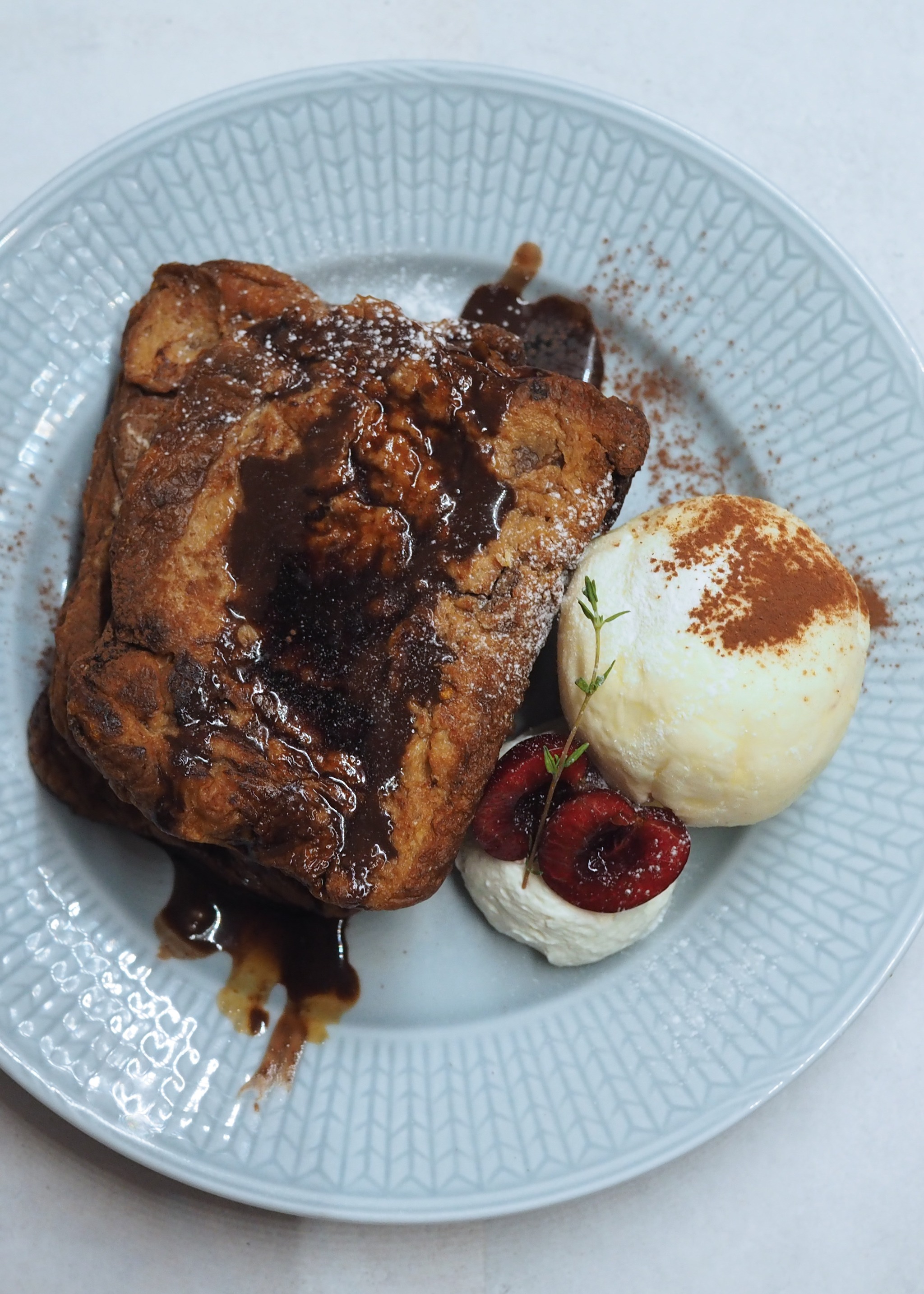 Enhance your brunch or coffee break with our "Café Mocha French Toast." This special French toast is made with a coffee-infused batter, crispy on the outside and fluffy on the inside. It's topped with creamy vanilla ice cream and further enriched with cacao rum whipped cream.